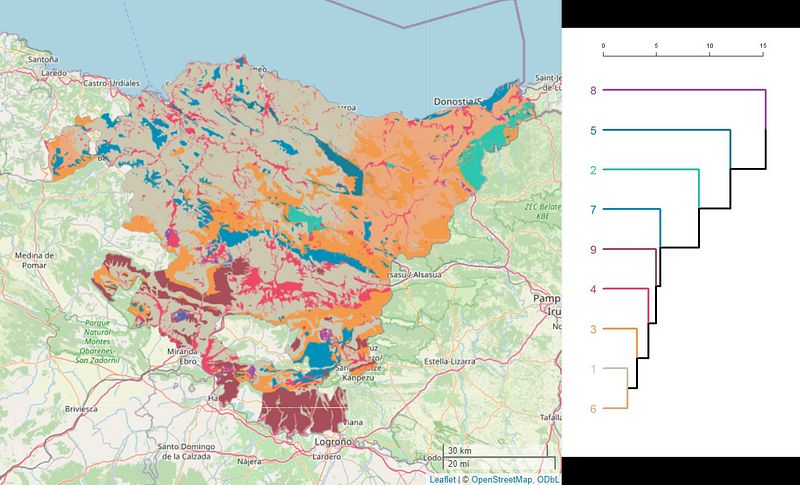 Map of soil units for the Basque Country. The dendrogram indicates the similarity of the soil units in terms of the environmental covariates used in k-means clustering (closer units in the dendrogram are more similar).